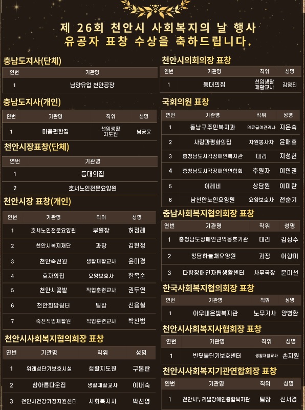 제 26회 천안시사회복지의 날 행사 유공자 표창수상 페이지 정보 작성자작성자 : 천사협 조회조회수 : 1,064회 작성일작성일 : 25-09-23 13:14 본문 수상을 축하 드립니다! 목록 이전글2025년 법인 정기 이사회의(2차) 개최 25.03.11 다음글「제26회 천안시사회복지의 날 행사」사회복지 유공자 추천 협조 요청 25.07.28